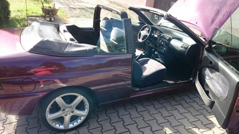 Prodám Ford Escort Kabrio r.v. 1995, 1.8Xr3i(77KW). Najeto 19x xxx(přesné číslo upřesním každému zájemci na požádání z důvodu že autem stále jezdím). Motorově perfektní stav. Prasklé čelní sklo a nefunkční ventilátor uvnitř auta. Nevím z jakéh důvodu, neměl jsem čas auto odvézt do servisu. Na plátěné střeše malé oděrky ale dovnitř neteče. I při velkých lijákách nebyla v autě ani kapka. Na autě jsou letní pneu R17 na Alu discích + dám 4x zimní pneu R15 na Alu discích Ford. Dále kožený kryt na staženou střechu a větrolam. Rádio s odnímatelným panelem s možností přijení subwoferu(dříve v autě byl, ale není součástí prodeje)PC cena rádia byla 20 000Kč. EKO DAŇ ZAPLACENA! Skvělé auto s nízkými provozními náklady a levnými součástkami. Pro další otázky mne neváhejte kontaktovat. PŘI RYCHLÉM JEDNÁNÍ JISTÁ SLEVA !!! Děkuji